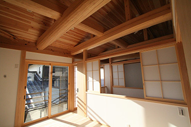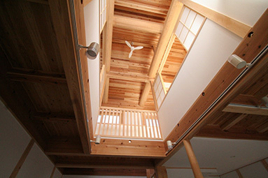 コンパクトな家の真中に大きな吹抜けがあり、各部屋を上下左右につなげています。