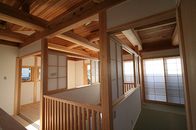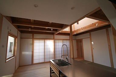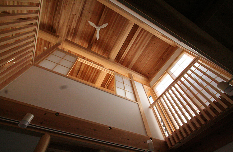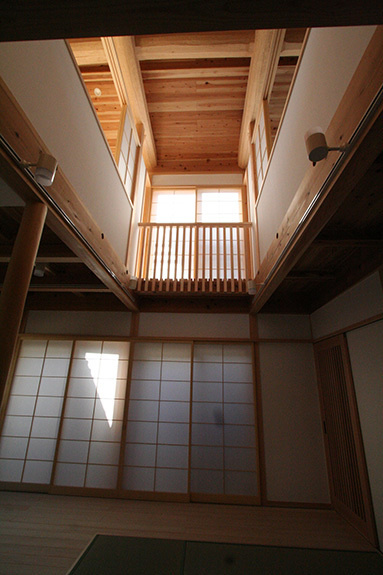 コンパクトな家の真中に大きな吹抜けがあり、各部屋を上下左右につなげています。